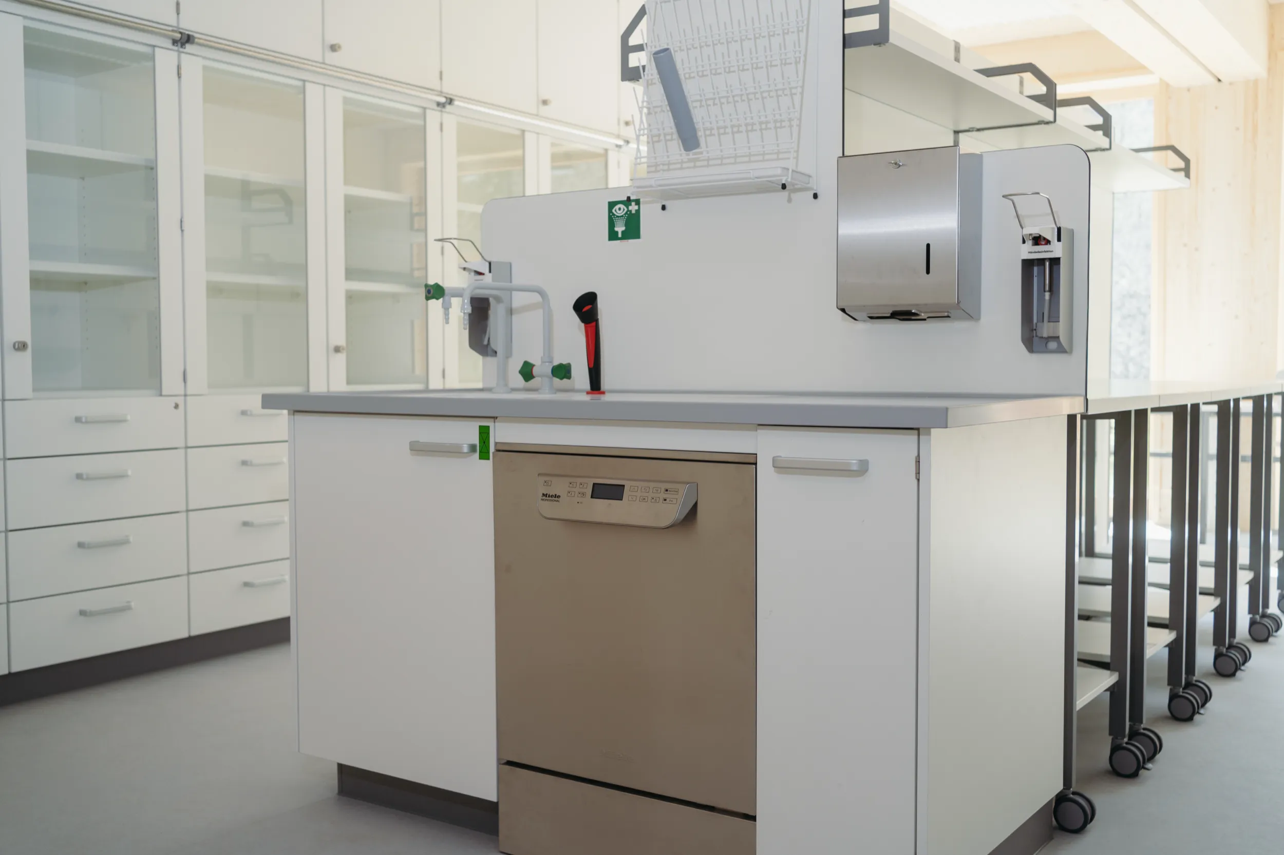 Doppelarbeitstisch mit Fahrtischen und Sockelunterbauten sowie Stirnspüle