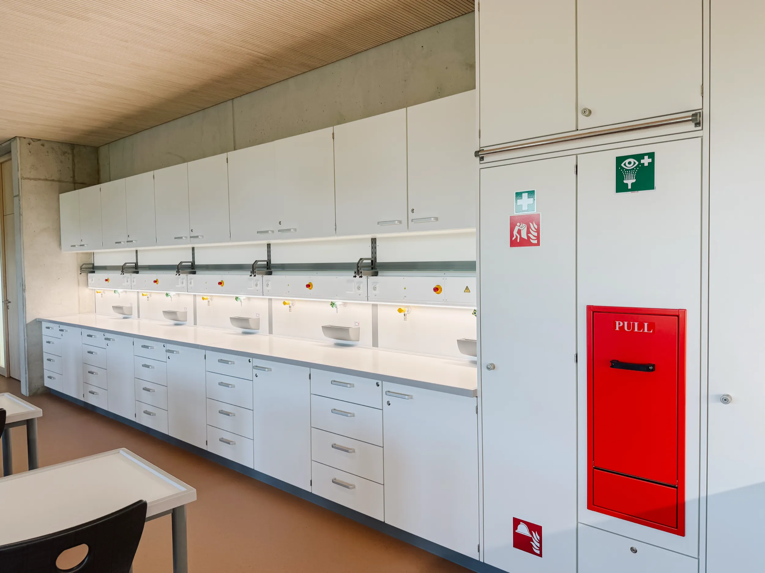 Schülerexperimentierplätze ausgeführt als Wandlabortische und Doppelarbeitstische