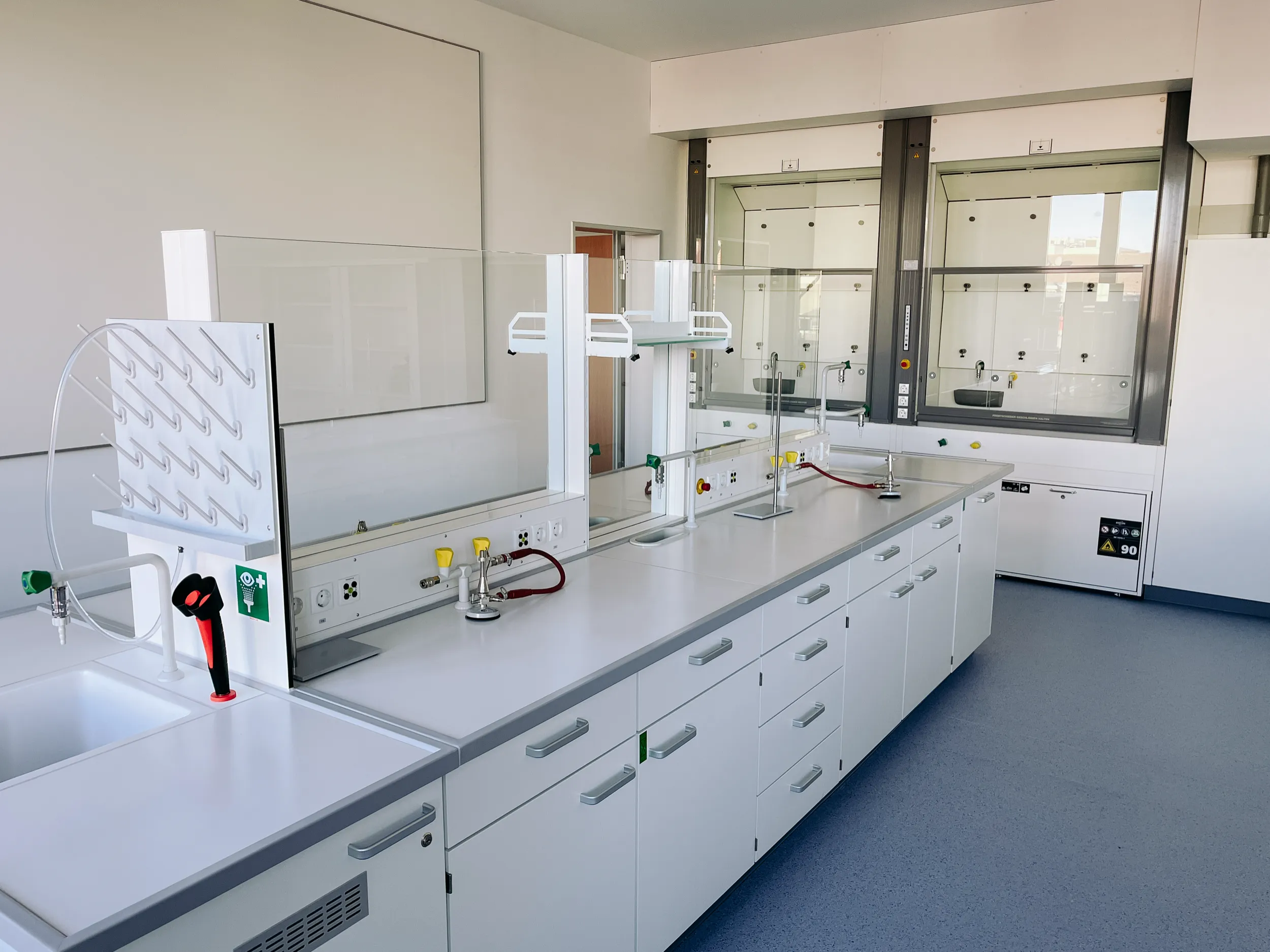 Schülerexperimentierplätze als Doppelarbeitstische mit Stinspüle